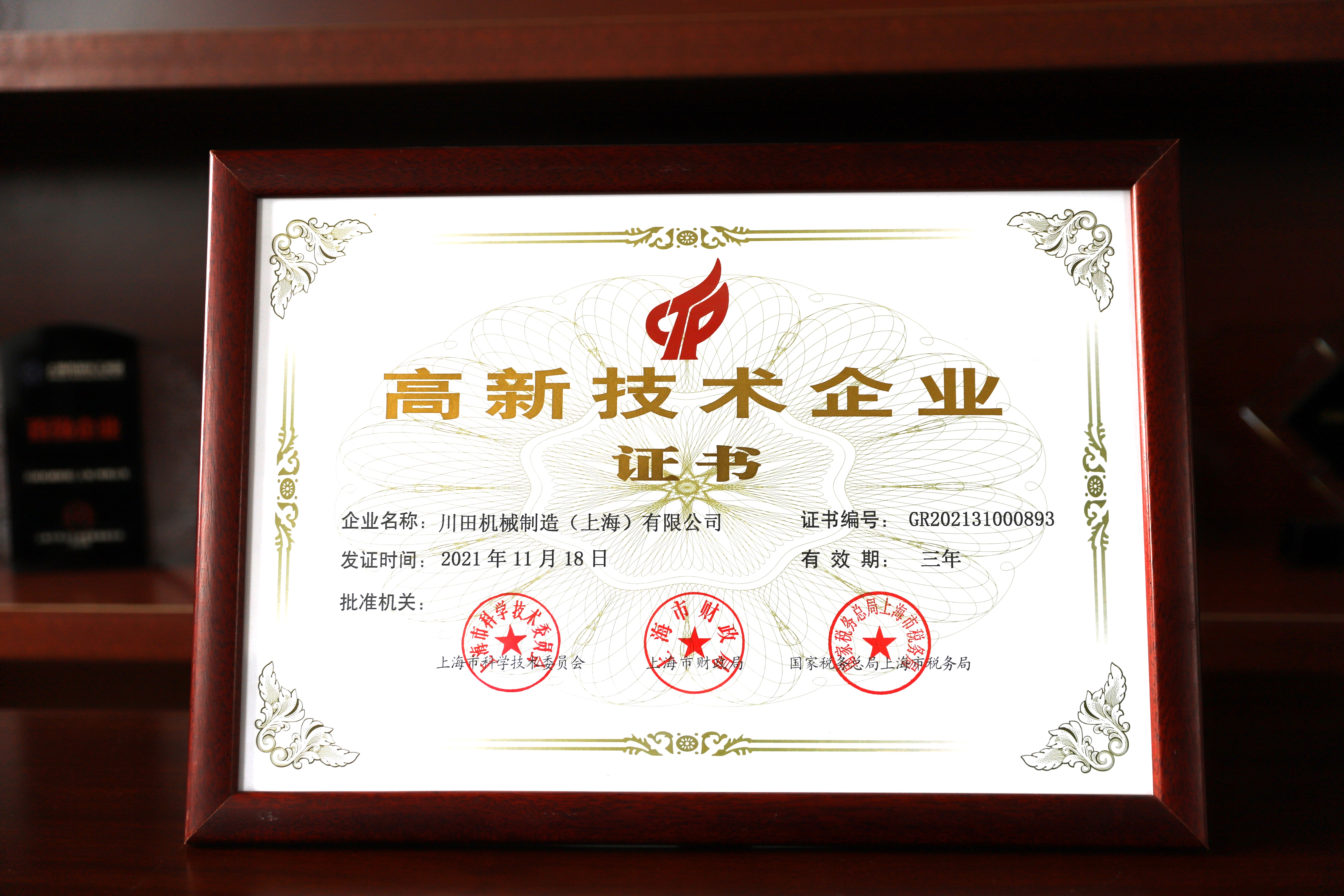 2021年度莘庄工業区優秀企業証書